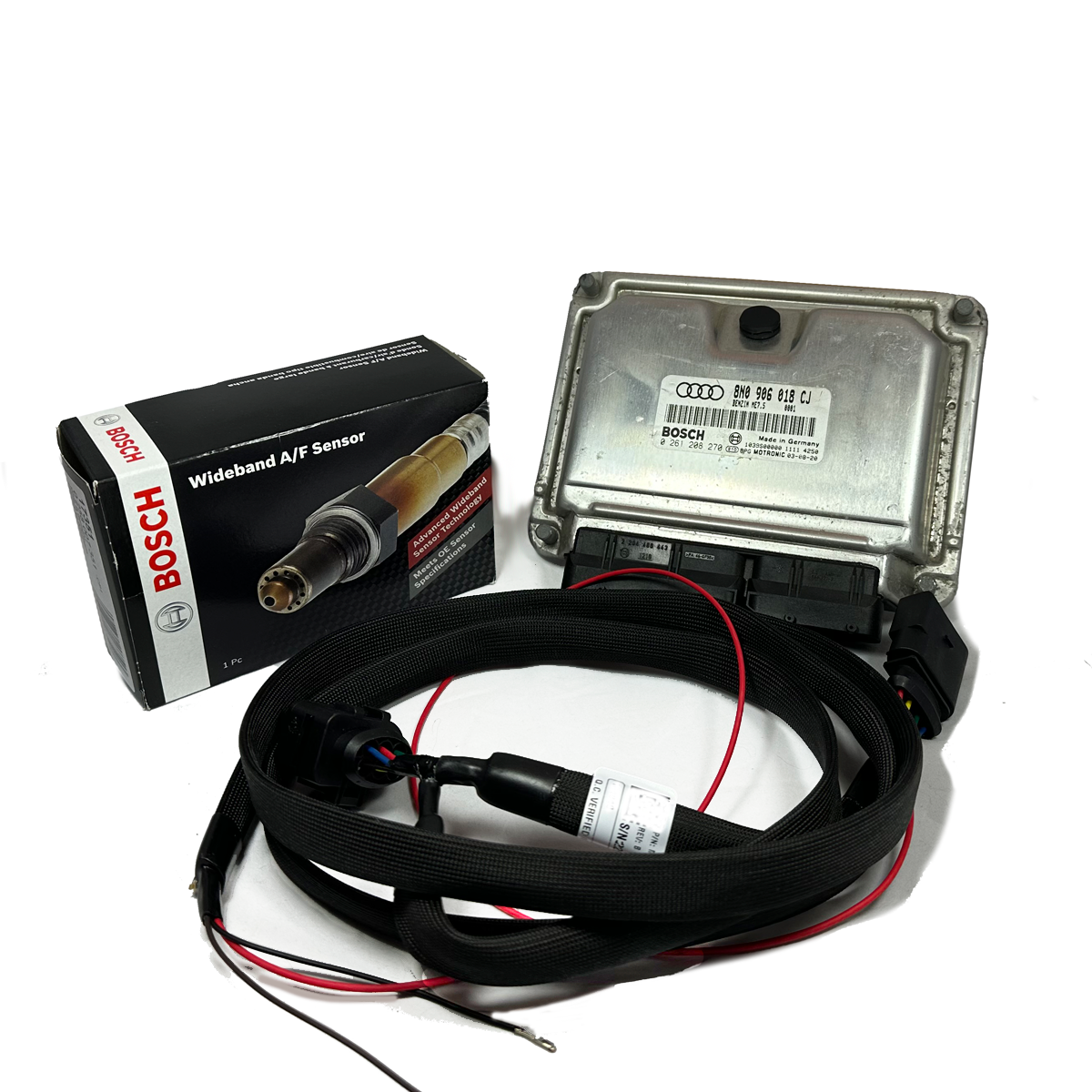 The kit includes the wideband O2 harness, a roll of Tesa high heat resistant tape, genuine Bosch O2 sensor, and an ECU. The harness is a bit longer than needed, you can tuck or trim to fit your needs. Please select based on your vehicle. The ECU will come with the immo off and set up for a VVT delete but otherwise stock. Tuning can be purchased separately.